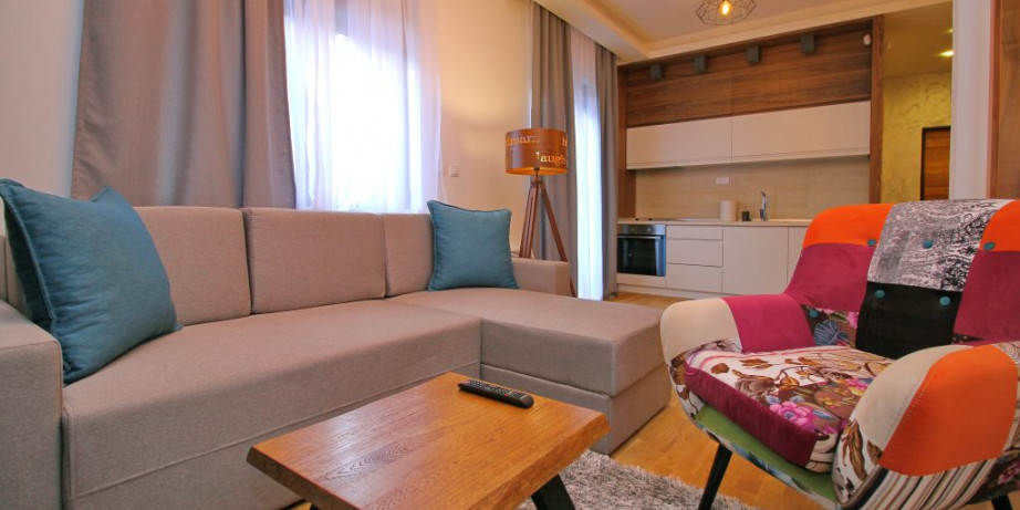 Svi naši apartmani su moderno i kompletno opremljeni, kako biste u potpunosti uživali u boravku. U svakom apartmanu vas čeka: piće dobrodošlice, besplatna WiFi konekcija, kablovska TV, peškiri (menjaju se nakon drugog noćenja), posteljina (menja se nakon četvrtog noćenja), pegla i daska za peglanje, kompletno posuđe, kozmetika za ličnu higijenu, fen, krevetac, noša, adapteri, hranilica i kadica za kupanje beba (na upit), smart TV u dnevnoj i spavaćoj sobi, većina apartmana poseduje terasu.