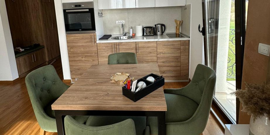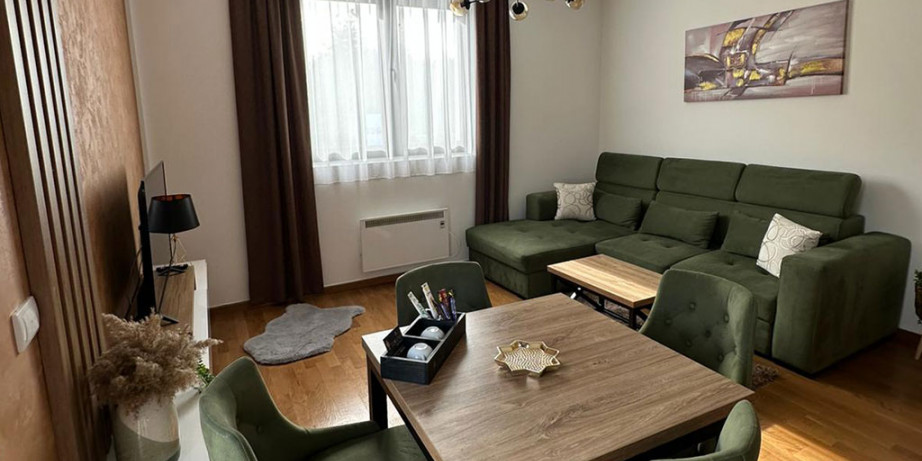 Svi naši apartmani su moderno i kompletno opremljeni, kako biste u potpunosti uživali u boravku. U svakom apartmanu vas čeka: piće dobrodošlice, besplatna WiFi konekcija, kablovska TV, peškiri (menjaju se nakon drugog noćenja), posteljina (menja se nakon četvrtog noćenja), pegla i daska za peglanje, kompletno posuđe, kozmetika za ličnu higijenu, fen, krevetac, noša, adapteri, hranilica i kadica za kupanje beba (na upit), smart TV u dnevnoj i spavaćoj sobi, većina apartmana poseduje terasu.